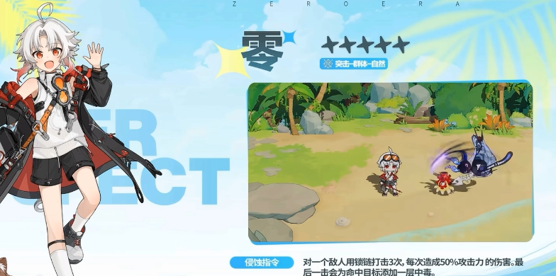零的基础技能“侵蚀指令”采用三段式链式攻击:前两段各造成50%攻击力的物理伤害,第三段除同样造成50%攻击力伤害外,额外为目标施加1层中毒状态。该中毒效果具备叠加特性,随回合推进可逐步强化持续伤害总量,是其核心续航能力来源之一。
