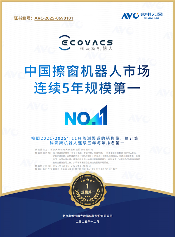 在中国市场,按照奥维云网统计口径,科沃斯已连续五年位居擦窗机器人市场规模第一,2025年1至11月销售额占比达到64.2%。无论在全球还是中国市场,科沃斯都已经成为擦窗机器人领域最具代表性的品牌之一。