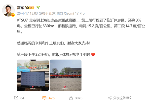 本次测试车型为新 SU7 Pro 赤霞红,雷军一行进入临沂服务区时,大批米粉拉起“祝雷总续航测试挑战成功!大美临沂欢迎你”横幅迎接。