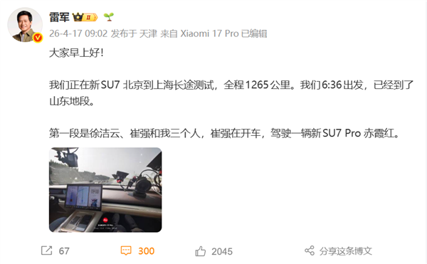 此外在滨州东服务区,雷军还介绍了同行的司机,一位是第一段司机是崔强(小米汽车研发副总裁,图一左三),第二段司机是张超(SU7 研发工程总监,图一左一),雷军透露他们都是小米的研发专家和专业车手。