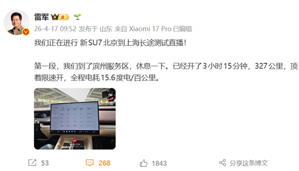 4月17日消息,今日早间,小米汽车创始人雷军正式开启小米新SU7京沪续航挑战,全程1265公里并同步直播。