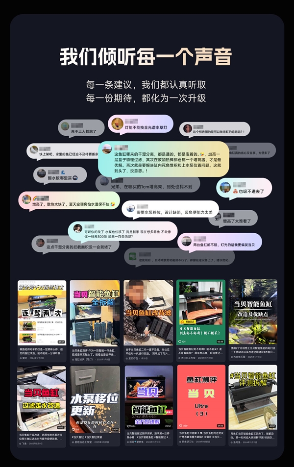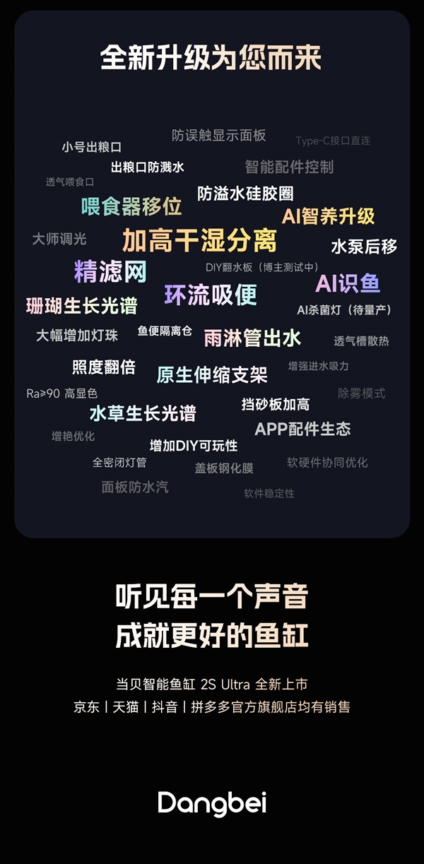 作为智能水族领域的重要参与者,当贝此次新品迭代充分倾听用户声音,历经半年打磨,力求为广大鱼友带来更优质的养鱼体验。据悉,自当贝一代智能鱼缸上市以来,产品凭借便捷的智能体验收获了大量用户青睐,同时也收到了诸多用户反馈,包括鱼友群的改装分享、测评博主的拆机建议等等。作为一家听劝的企业,当贝在过去半年里全力投入新品研发,针对用户痛点进行全方位优化。