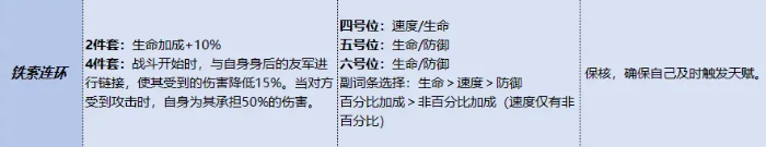首选锦囊为铁锁连环:该锦囊不仅强化郭嘉对敌方增益状态的压制能力(尤其配合专属武器使用时可精准驱散关键Buff),更通过套装效果构建团队防护体系。两件套提供10%生命值加成;四件套激活后,战斗初始即与后排队友建立连环链接——使队友所受伤害降低15%,且当敌方对我方单位发起攻击时,郭嘉可主动承担50%的原始伤害,显著提升队伍整体承伤韧性。此配置将郭嘉从单点输出者转化为团队生存中枢。