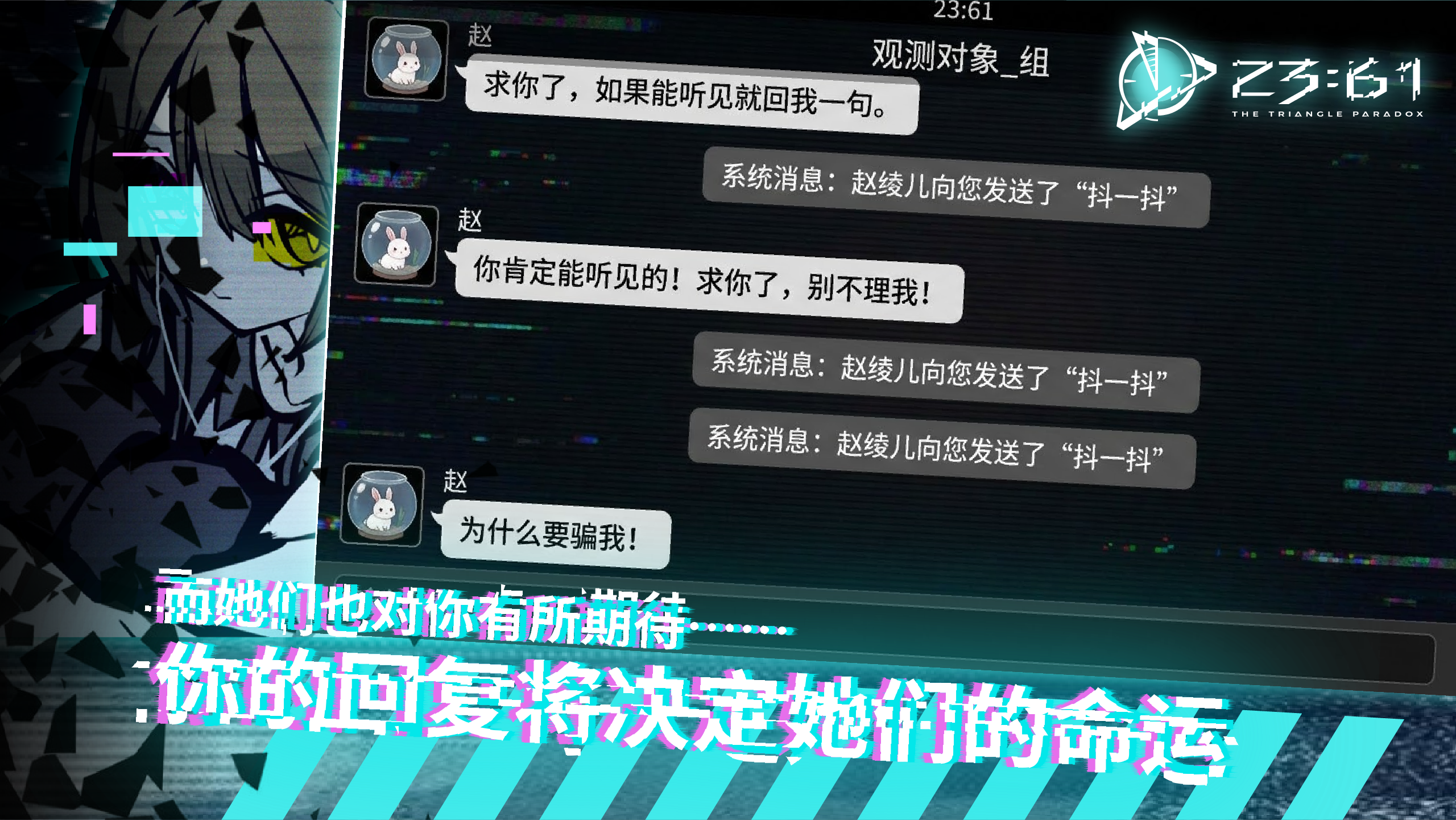 另外,在游戏当中,背景往往会决定宿命感时间就停留在一个根本就不会存在的时间段,那就是23:61,毕竟在这个时间段,整个世界已经陷入了无尽的轮回当中,玩家所需要做的就是尽可能地去打破僵局。此时,有两位少女需要玩家帮助,玩家所需要做的就是尽可能的做好合适的选择,毕竟玩家此时此刻将会决定哪一位少女能够活下来。没有活下来的那位少女,最终将会被选择遗忘。