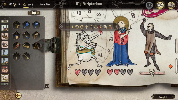 在故事模式中创建您的专属缮写师形象,并接受来自全国各地尊贵赞助人的委托。绘制中世纪主题的插画,从战争与罗曼蒂克史到情书与勒索信,各种委托五花八门。在设计地图、梗图、化装舞会和其他奇思妙想的同时,在充斥着流言蜚语的王国中揭开一场隐藏的皇室大戏。