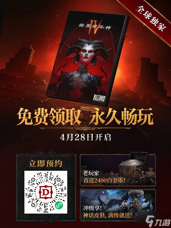 凡在4月28日之前已拥有任意版本国服《暗黑破坏神Ⅳ》的玩家,均可在4月28日0点至5月27日23:59期间免费领取 2400 白金币!使用这份属于先锋的致意,定制你的专属外观与装备,率先直面憎恨的阴影。