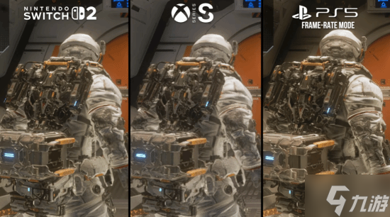 不过,得益于DLSS技术,Switch 2版本表现仍有亮点。Digital Foundry认为,该作实际渲染分辨率约为540p,并通过DLSS提升至1080p。虽然低于PS5的1440p输出,但整体未来感场景依旧具有不错的表现力。