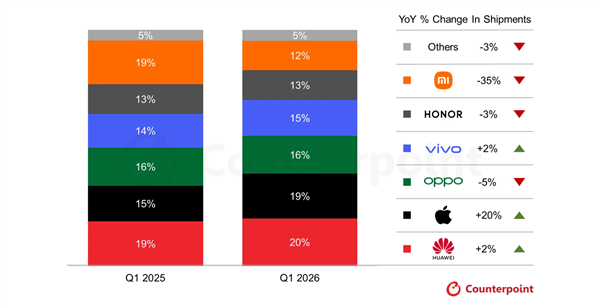 2026 Q1中国手机出货量:华为手机稳居第一、苹果增速最快出货量激增20%