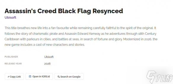 自今年3月育碧确认《刺客信条4:黑旗》重制版存在后,相关传闻不断。目前该作已出现在印尼游戏评级系统(IGRS)中,更多关键信息曝光。