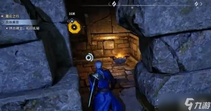 石碑碎片一共要收集三块,分散在附近几个地方。第一块在左侧建筑侧面的洞穴里,洞口有个标靶,打破标靶门就开了,进去拿就行。第二块在前方铁栅栏里面,这里要动点脑子,把蓝色石头牵引过去压住压力板,栅栏门才会打开。第三块最简单,直接在最上方的平台上,走上去拾取就好。三块碎片都拿到之后,回去把碎片安装拼接到石碑上,完成拓印,等NPC过来看完,再对话一次。