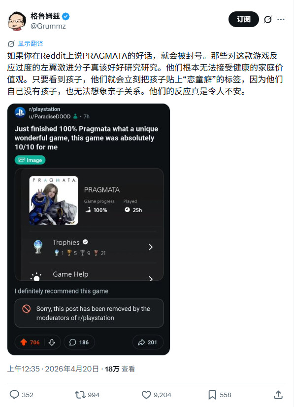 与此同时,网友发现,如果你在Reddit上说《识质存在》的好话,平台甚至会封禁你。原因是Reddit的版主都是一群左翼疯子,他们无法接受这种温馨、健康的家庭价值观。