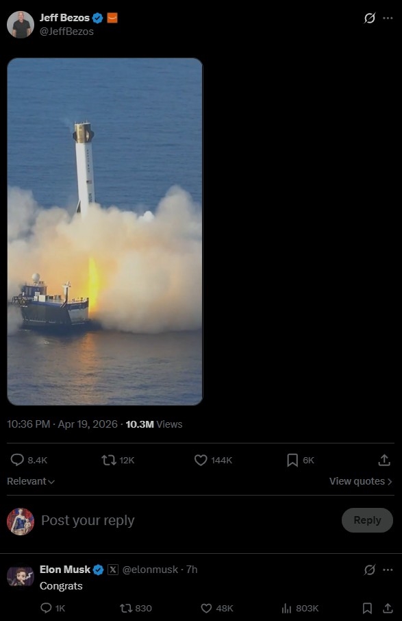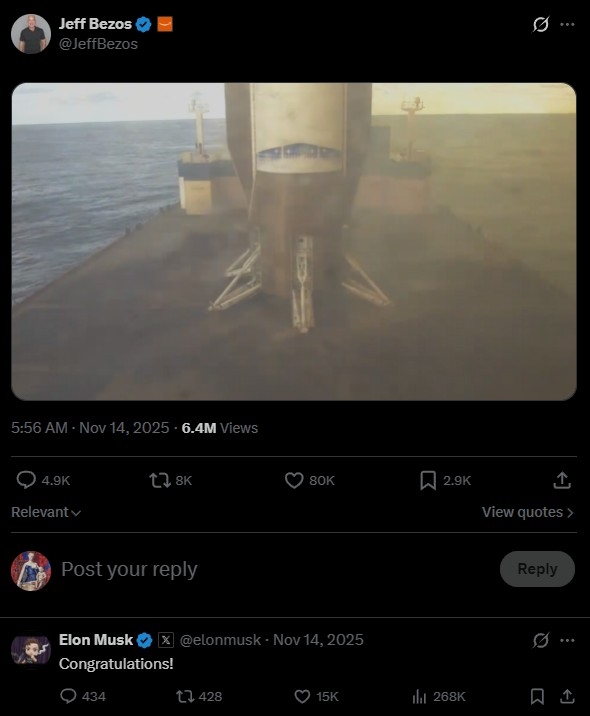 马斯克皮笑肉不笑地向对手表示祝贺。这是贝佐斯名下蓝色起源公司第二次成功回收新格伦火箭一级助推器,那一次马斯克至少还用了感叹号: