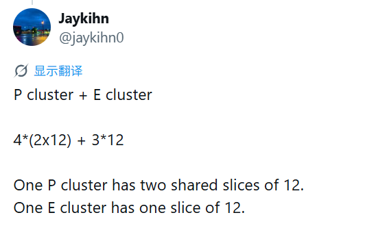 P核每个对应12MB bLLC,E核则还是每4个为一组,共享12MB bLLC。