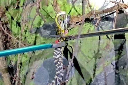 这条大蛇体长大概1.5米,被它吞食的小蛇长度在1米左右,场面看起来比较惊悚。消防员使用专业的捕蛇夹,小心地将两条蛇分离开。