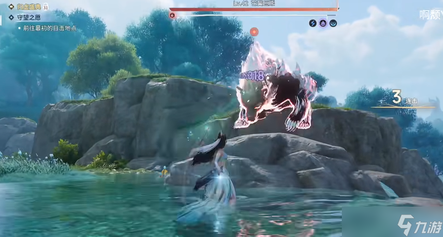 1、传送至遁丘传送点后,视角左转,朝BOSS探索点走,看见巨熊后从左侧往山上绕,绕到熊的背后。