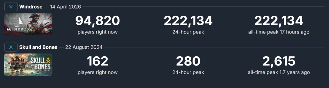根据SteamDB显示,《风启之旅》在PC Steam上的同时在线峰值为22万2134人,而2024年8月推出的《碧海黑帆》其在线峰值只有2615人。简单计算,《风启之旅》在线峰值大约是《碧海黑帆》的85倍。当然,《碧海黑帆》当初登陆了多个平台,即使加上育碧自家PC平台以及主机,充其量也不会太多。
