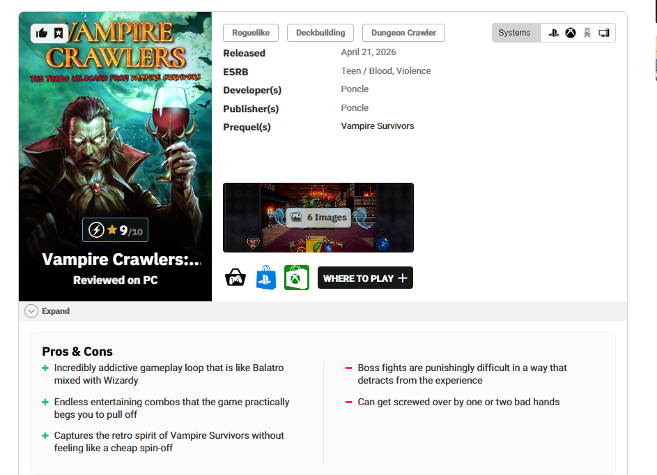 《吸血鬼探索者》是我2026年度游戏的强力竞争者。如果不是因为存在一些需要调整的难度问题,它早就锁定了这个位置——哪怕有《GTA6》也不管。核心玩法循环既有趣又令人上瘾,鼓励玩家不断尝试,并为不同的流派搭配提供了无数可能性。探索地牢从未如此有趣,比起《吸血鬼幸存者》的续作,我更渴望看到更多《吸血鬼探索者》的内容。