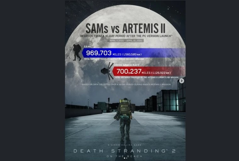 小岛秀夫分享了《死亡搁浅2:冥滩之上》的一项特殊的统计数据,将玩家的成就与美国宇航局NASA的太空任务进行了比较。据他透露,在PC版发售后的前10天里,玩家累计行走的总距离超过了同期的阿尔忒弥斯2号任务数据。