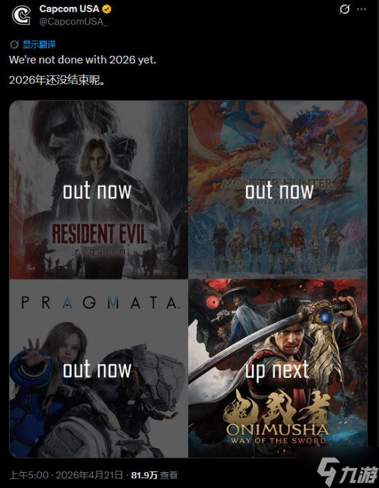 但即便如此,卡普空在2026年依旧有着一张底牌尚未打出。今日,卡普空美国分部官方在社交媒体上霸气发文:“我们2026年还没完。”暗示还有重磅作品在路上了。