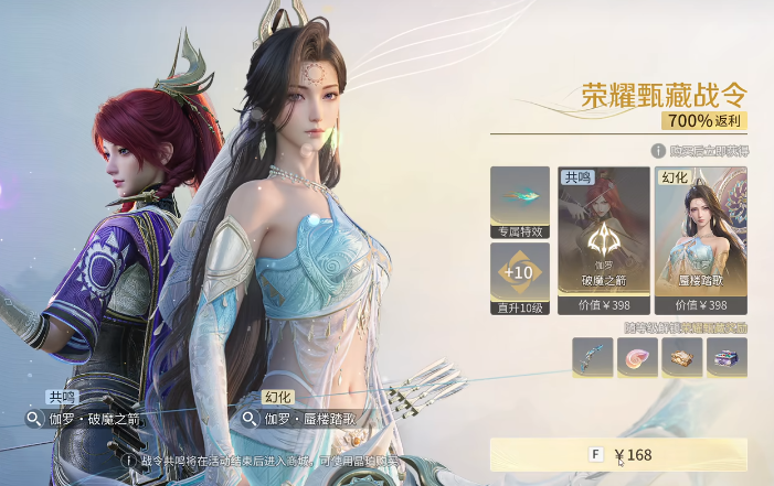 在游戏里会有大量限定角色时装,更换时装之后,角色在挑战过程中会更耀眼,想获取限定时装玩家需要在游戏里通过抽取的方式,每次抽取都会消耗特定的游戏材料,材料花费完毕之后,需要通过氪金的方式购买获取,商城里会针对不同的材料数量给出相应的价格,从6元到648元不等,玩家可以根据自身的需求和能力做出选择,游戏里还会设定珍藏战令,利用战令角色在游戏里会触发共鸣状态,操控角色对战的过程中可以幻化成其他成员,荣耀珍藏战令价格为168,购买之后可以获得两名角色,同时还会获得专属特效以及其他奖励。