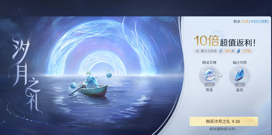 游戏里还会设定比较常见的月卡,花费30元购买汐月之礼,会立即获得璇晶和晶珀,每天都可以领取300璇晶和90晶珀,总共可以领取30天,璇晶和晶珀,可以参与游戏里的抽卡或者特定活动,在给角色捏脸的过程中支持自定义染发,条件就是玩家必须要消耗相应的璇晶,有需求的玩家可以消耗资源,打造更加个性化的角色外观。