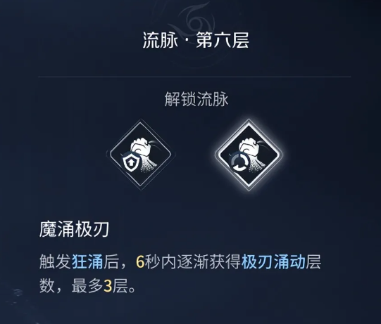 流脉推荐大家带魔涌动、极刃,6层流脉选择快速叠极刃层,从而加速攒触发技打出伤害,另一个是能加防御的一般不推荐选择,第10层极刃是招架成功之后获得一层BUFF,最多三层每层提升50%极刃反击伤害,这些提升后能让打出的输出相当可观。