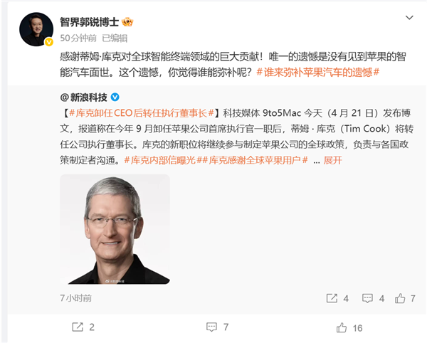同日,智界董事长郭锐在社交媒体发文,对库克在全球智能终端领域的贡献表示感谢,同时提及库克任期内的一大遗憾:苹果智能汽车项目未能落地。
