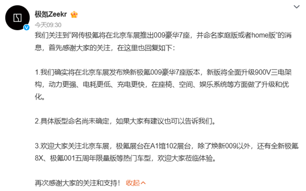 官方确认,“我们确实将在北京车展发布焕新极氪009豪华7座版本,新版将全面升级900V三电架构,动力更强、电耗更低、充电更快,在座椅、空间、娱乐系统等方面做了升级和优化。”