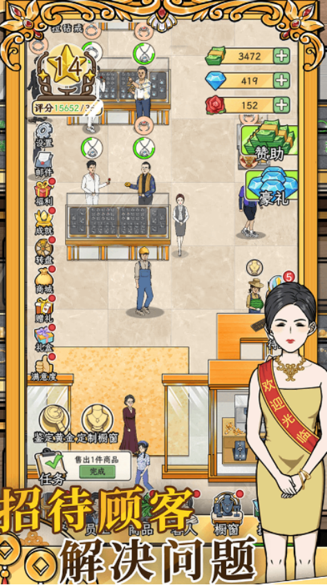 进入游戏之后,会被其独特的画风深深所吸引,虽然并没有采用写实风格,但是也能给玩家带来足够治愈,又非常优越的体验感,开一家属于自己的黄金店面,日进斗金,在店铺当中有各种各样的商品,除了有黄金之外,还有各类型珠宝,可以自由进货,同时还要学会聘请优质团队,为各种顾客带来更加优质的服务,只有这样才能够获得更多顾客的喜爱与光顾,同时也能获得更多收益。店铺升级也非常关键,搬迁新的地点,扩张店铺阵容,扩大规模。