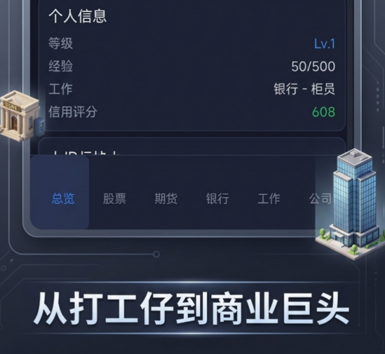 游戏推送出完整的个人发展模式,在最初通过求职打工的方式来获得原始资金,随着时间推移逐渐创业,拥有相当真实的金融与多层次经济环境,所有玩家都要合理的应对具体的市场波动以及不同的商业竞争,在竞争的过程当中,可能会遇到现实生活中的尔虞我诈,玩家要利用灵活的反应能力来寻找机遇,并应对层层挑战。