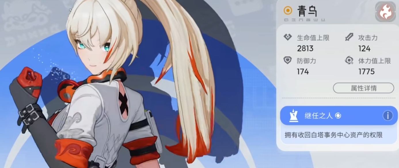 青乌是月能管理局外勤队的一员,是位爆发力很强的火属性输出。她最典型的技能是闪射回旋,它具有很强的机动性,并且可以给敌人造成持续的灼烧伤害。青鸟的战斗核心是“光域”,当层数达到三层的时候就会触发终结技“天光如灼”,瞬间释放出大面积的高倍率火属性伤害,还会附带禁疗效果来克制回复型敌人。技能树加点上要以光域层数快速叠加、灼烧伤害倍率最大为原则,发挥出她的爆发窗口期的输出优势,使她成为战场上收割敌人的利刃。