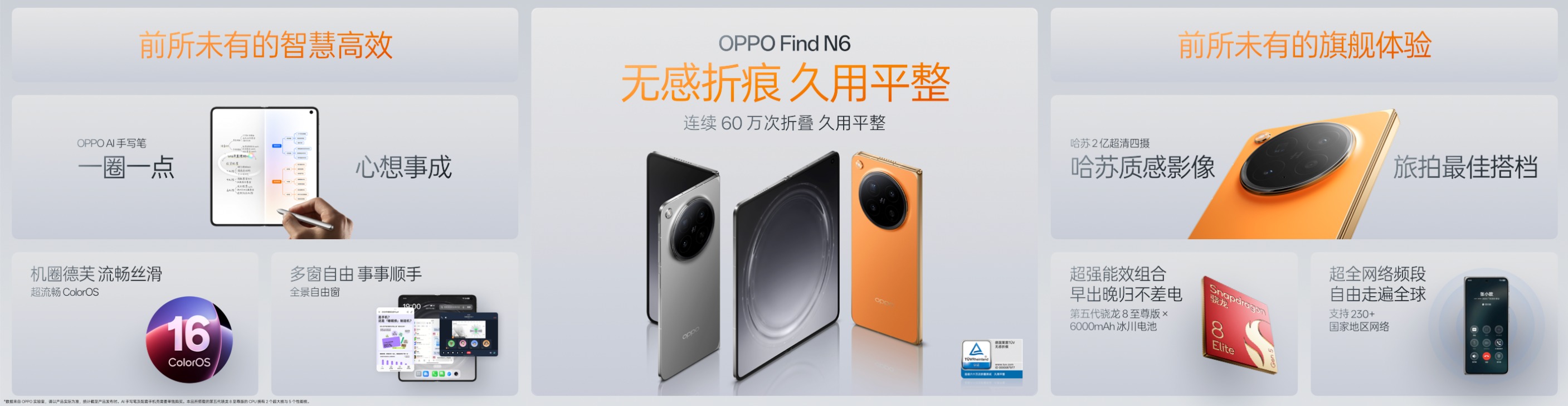 Find N6 的技术突破也很快得到市场和用户的认可。在首销当日,Find N6 创下京东、天猫双平台近一年全品牌、全形态折叠屏销售额纪录,多家线下门店在首销当日相继贴出售罄提示。口碑与销量的双重丰收,直观展现了Find N6的强大市场号召力,也再次印证了 OPPO坚持长期主义、打磨极致产品的战略定力。