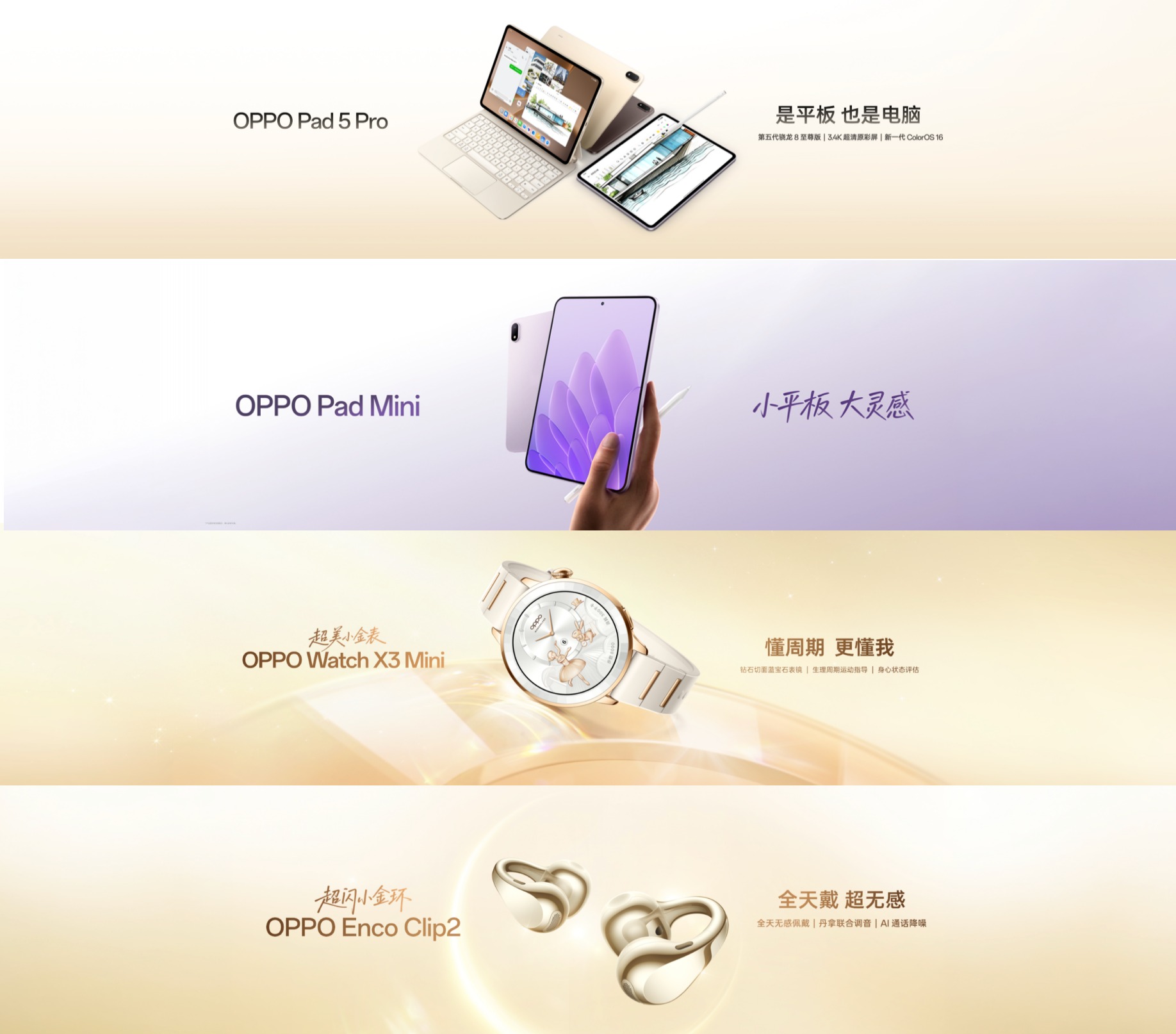 2026 年,OPPO 进一步加码 IoT 布局,产品矩阵继续扩容。旗舰级平板新品 Pad 5 Pro 延续 OPPO 在生产力与影音体验上的产品优势,为用户带来更完整、更专业的旗舰体验;全新Watch X3 mini 作为行业首款专为女性生理周期减脂定制的智能手表,以精准的用户洞察切入细分健康场景,填补市场空白;新一代安卓旗舰智能手表 Watch X3 延续"安卓表皇"的产品基因,发布后在线下渠道实现同比 120% 的亮眼增长;全新耳夹式耳机 Enco Clip2 以开放式佩戴的舒适体验满足通勤出街的百搭需求,全天佩戴轻松无感;小尺寸平板 Pad mini 则进一步完善 OPPO 平板产品线在便携场景下的布局,覆盖轻度生产力与娱乐消费用户。