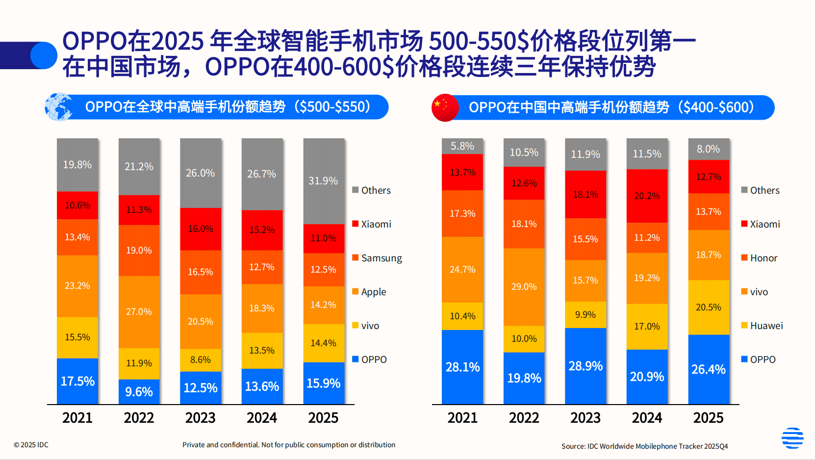 随着Ultra系列出海进程的持续加深,OPPO在全球市场的高端机型占比持续提升。根据权威市场调研机构IDC的数据显示,2025年,OPPO在全球500美元~550美元价位段稳居第一,并以 284 美元的平均售价位列全球第三,高端化成果日益显著。更重要的是,OPPO在海外市场正在完成品牌认知层面的质变,即从「性价比选择」向「高端可靠品牌」的认知跃迁,越来越多全球消费者将OPPO视为高端智能手机的可靠选项,而非性价比替代方案。