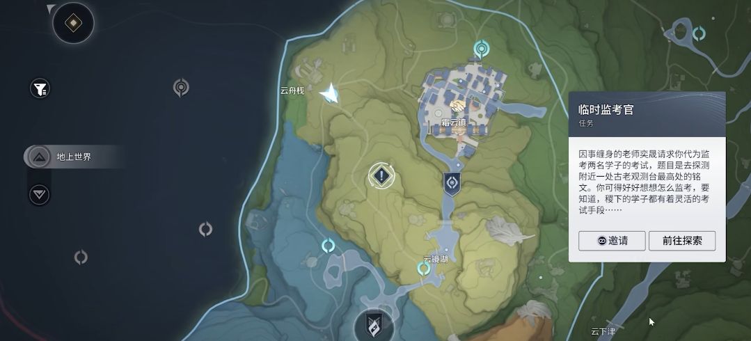 任务起始后,自动开启追踪路径,目标地点为霜云镇·云舟栈。抵达传送点后,请沿栈区东侧小径持续前行,直至视野中出现独立院落式建筑。进入该建筑后,与NPC奕晟对话,即可正式接取【监考余波】见闻任务。