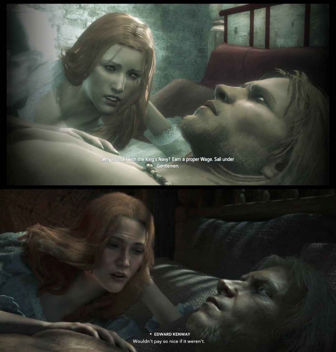 在Reddit平台上,一位名为 ZamnBoii 的用户发布了一张新的、据称是《刺客信条:黑旗》重制版的实机宣传截图。这次的画面取自一段过场动画,并直接与原版游戏中的同一场景进行了对比。截图中呈现的正是主角爱德华·肯维与他的妻子卡罗琳在卧室中的著名剧情片段。