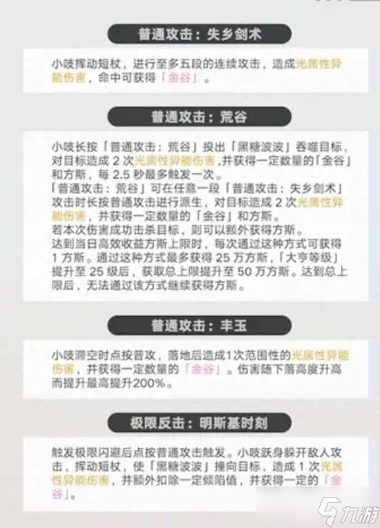 小吱滞空时点按普攻,落地后造成一次大范围性的光属性异能伤害,并获得一定数量的金谷,伤害随下落高度升高而提升,最高提升200%。