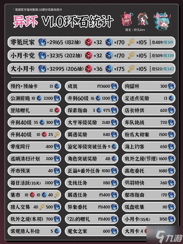 《异环》即将开服,开服后会上线不少活动,官方也会发放各种福利,那么玩家们能够获得多少抽呢?下面请看由“轩儿Zero”带来的《异环》1.0版本抽卡资源获取统计,一起来看看吧。