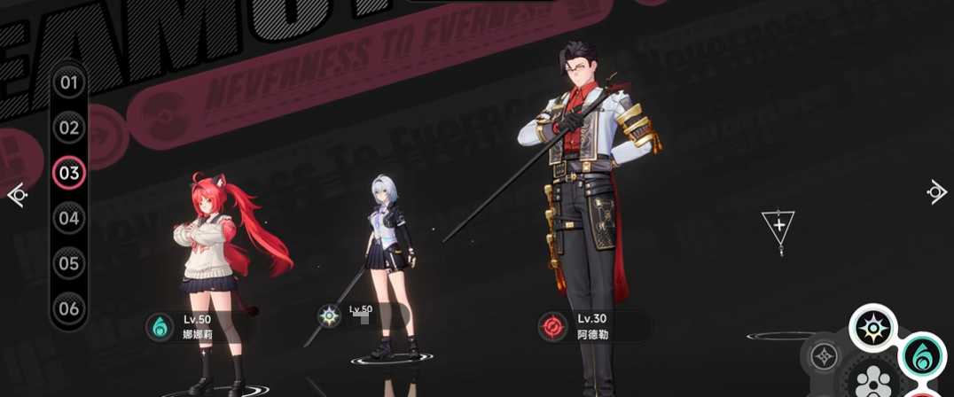 还有一种配队方式,薄荷+主角+早雾,直接打造完美的作战闭环,保证了高效流畅的作战节奏;薄荷主要负责增益,给队友提供攻击力和暴击率buff,为此后爆发打下基础;零的招式技能、大招,可快速降低对手血量,触发QTE后,切换娜娜莉进场,瞬间放出积蓄能量进行收割,阵容整体特色那就是容错很高。