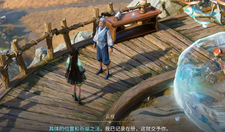 收集完毕后,前往吊桥入口处,点击场景中的祈福石即可完成首次仪式。第二处所需道具为【丰云大饼】,可在小镇内陈迪经营的商铺中直接购得;对应祈福石位置位于吊桥正下方。第三处需先抵达【丰云湖】,靠近湖边时会遇见垂钓的阿婆,与其交谈可获知祈福石藏于湖底,并同步获得一枚鱼饵。