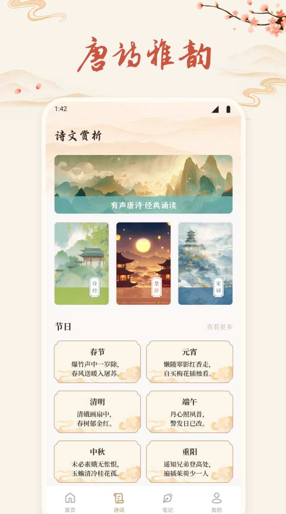 别看平台收录的诗歌诗句数量诸多,但是每一首诗句都会根据其意境或者是创作的朝代进行分类,有些还会按照作者当时的情感进行编排,能够帮助你轻松了解每一篇诗句背后的含义,以及看到来自名家的赏析,专业的典故解析,包括译文对照都能够让你更好的融入意境学习。