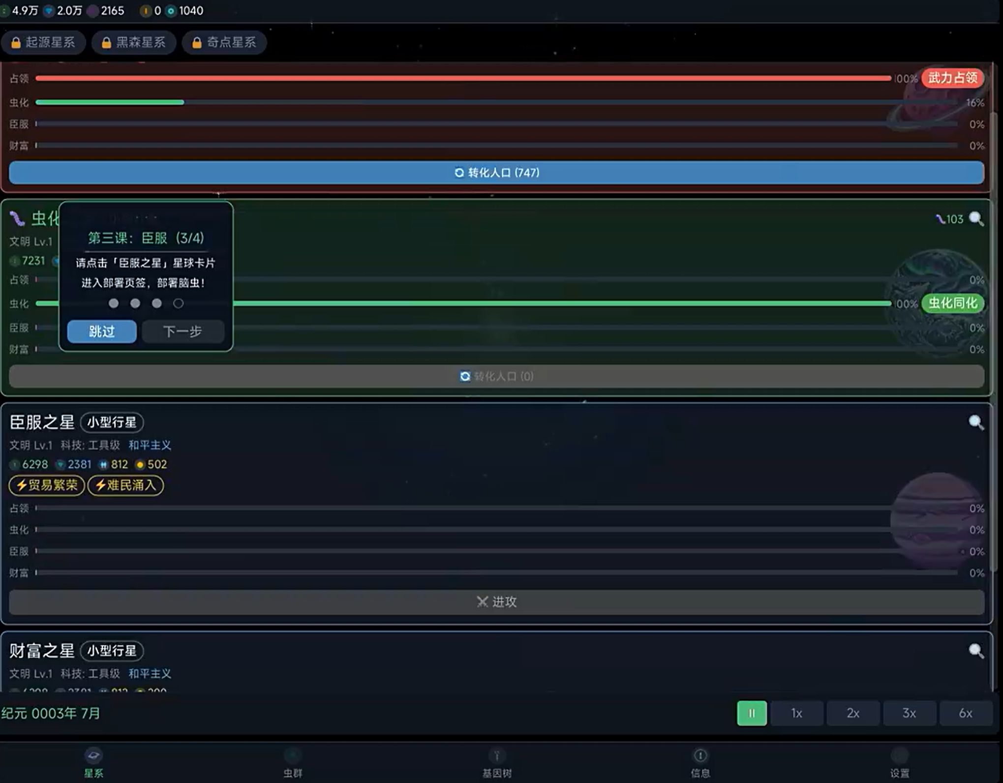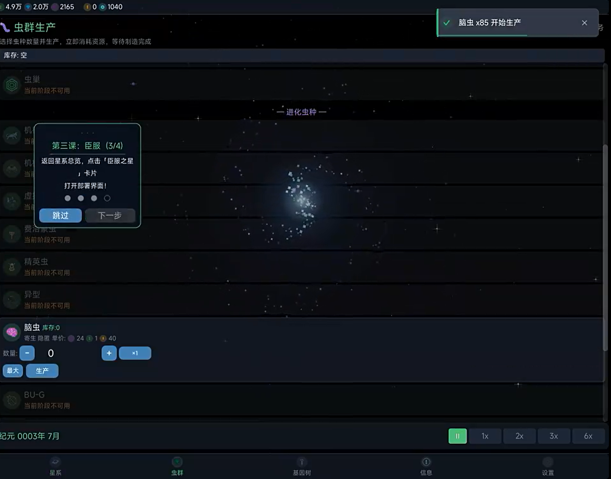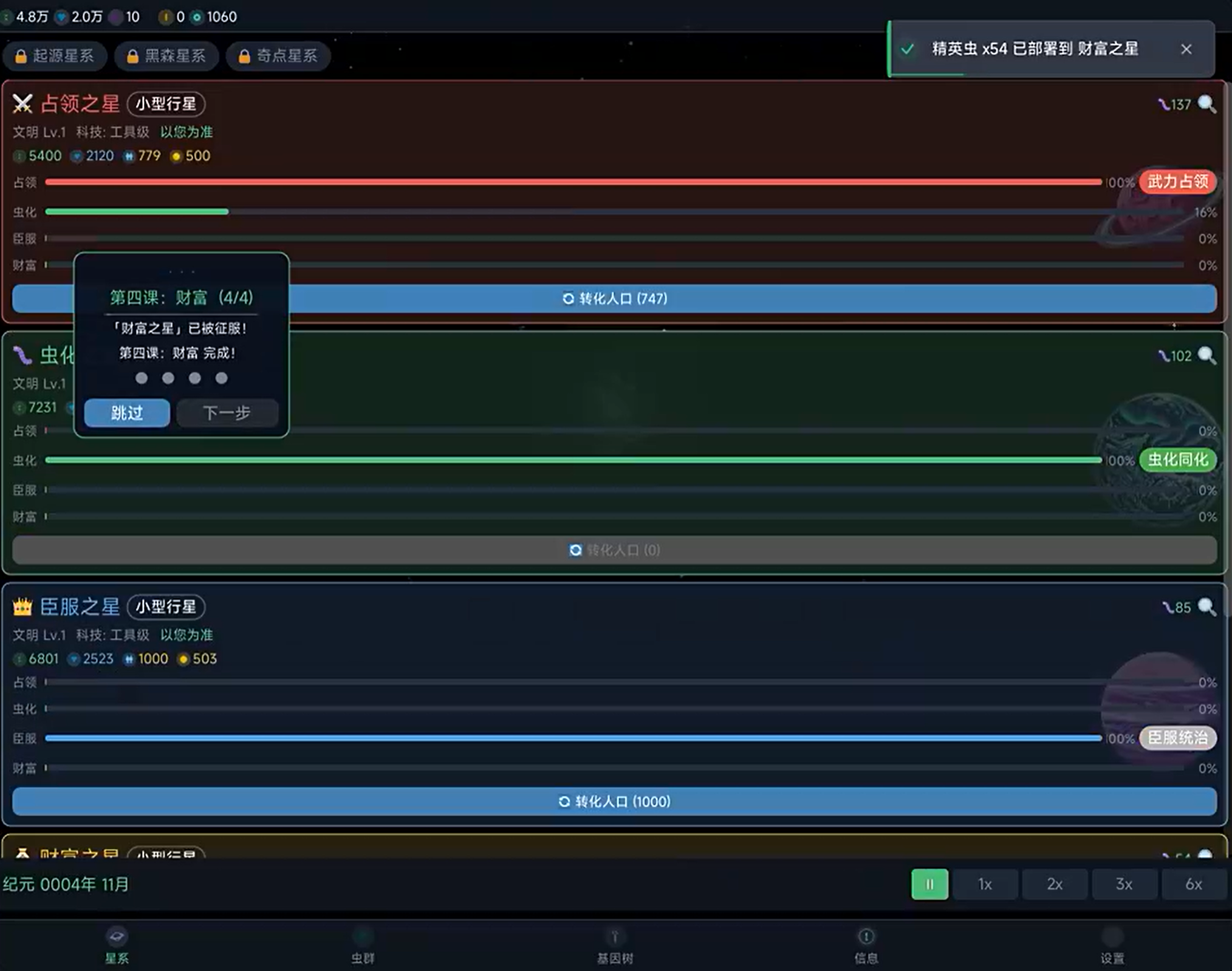 游戏主循环围绕“虫群进化—星域拓张”双轴展开。玩家需从基础工蜂单位起步,逐步研发并部署战斗型、侦查型、环境适应型等十余类功能虫族;通过基因强化、巢穴升级、母舰改造等方式持续提升种群上限与作战效能。地图架构覆盖多个独立星系,每个星系内含若干行星,其文明发展阶段(石器至量子纪元)、科技成熟度、生态抗性参数均存在显著差异,为玩家提供高度拟真的星际殖民模拟体验。