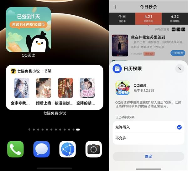 · 贴心提醒,不错过每一刻:七猫免费小说的桌面服务卡片可以一键领取“每日赠币”。面向鸿蒙端用户的免广告阅读福利(4月24日截止),加上手机与平板之间的应用接续无缝流转,阅读不中断,体验更专注。