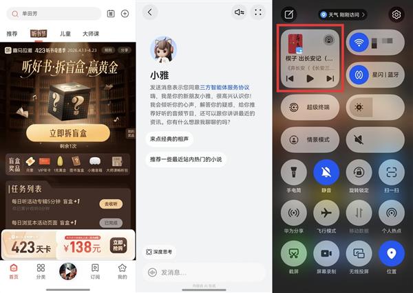 · 小艺推荐,懂你所听:喜马拉雅的小艺会根据你的喜好,主动推荐“423听书奇遇季”的优质专辑。小雅智能体与小艺的深度协同,让你从选书到听完,只需自然对话。
