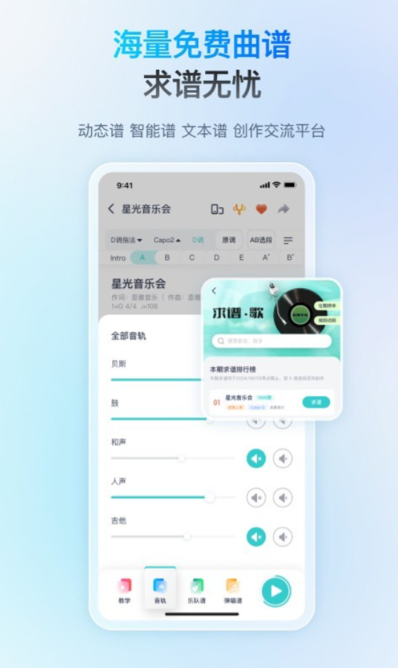 国内首个主打多轨分层控制的高清数字乐谱播放平台。其核心技术是音轨独立开关机制,用户可按需启用主音轨、和声轨、节奏轨或低音轨,适用于独奏精练或合奏模拟。每份乐谱均标注详细演奏技法说明、和声进行标记及指法提示。变速变调功能深度适配吉他弹唱场景,自动推算变调夹对应和弦,乐谱与伴奏时间轴误差低于50ms,进度条可视化强,节拍指示明确,大幅降低跟练失误率。