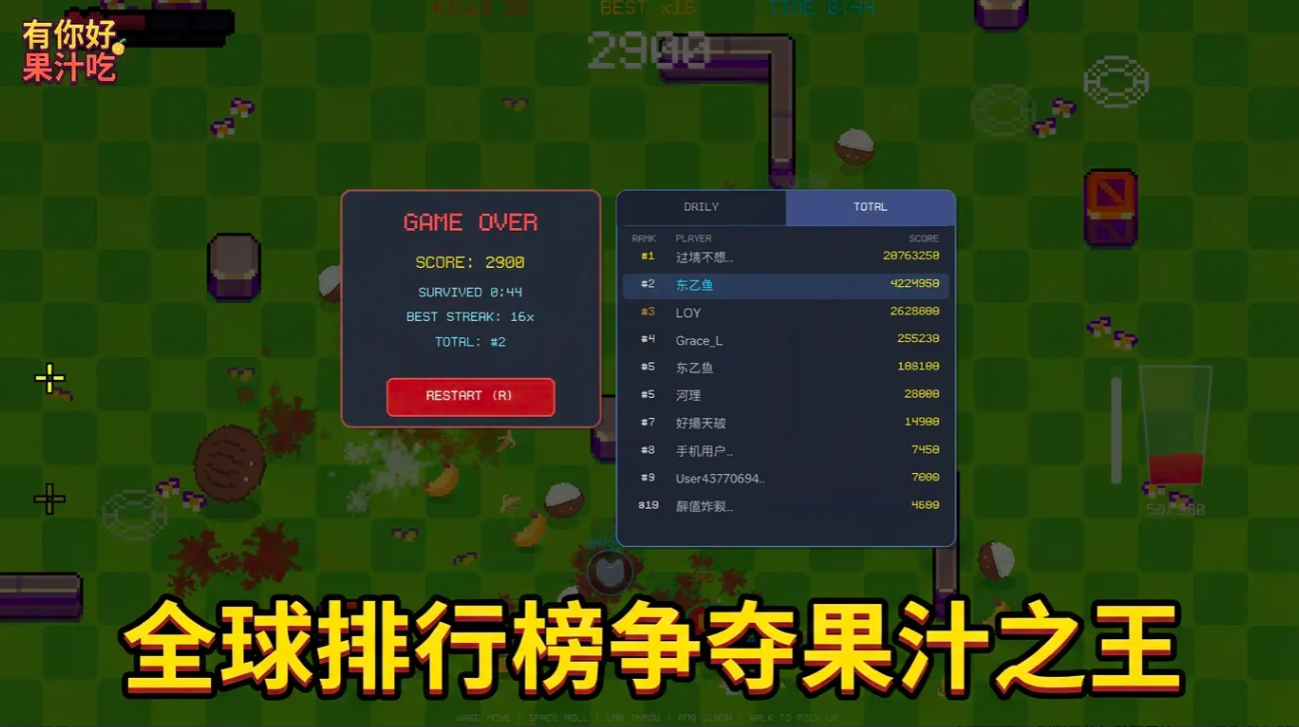 游戏的节奏感和动效更是绝佳,特别是在被葡萄弹虐上百遍之后,不仅要学会快速躲避,适当的迎难而上,还可以让你开启直接的暴力美学,而目前最爽感的玩法就是手机触屏模式。指尖弹反精准度更高,而且伴随着每一次的猛砍,大屏满屏爆汁冲击力十足,让你开启更强的果汁大王争夺战!生存挑战玩法可以让你轻松开启联机模式,凑够一整瓶果汁,走可直接进入暴走状态!进入疯狂水果boss砍杀状态。