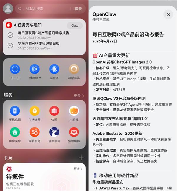 在AI协同体验上,华为负一屏最近的更新更将“松弛感”拉满。在鸿蒙操作系统6.1上,负一屏的服务动态卡片支持与Claw(龙虾)绑定。当数字助理Claw(龙虾)在后台处理任务时,负一屏的“AI任务完成通知”卡片会实时同步结果,无需打开电脑或多个APP,就能轻松知晓任务进度,实现“只关心结果,不干预过程”的高效体验,让科技真正为生活“减负”。