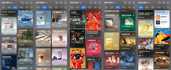 同时,从负一屏底部上滑进入“探索元服务”,你能发现一个全新的空间:这里就像一个服务的自由市场,打破了APP的物理边界。旅行、本地生活、购物、音乐……各种服务按类别平铺开来,逛一逛总能发现惊喜。同时它还有情景感知和记忆能力,可以根据用户所处场景及过往使用习惯个性化推荐服务,带来“服务找人”新体验。