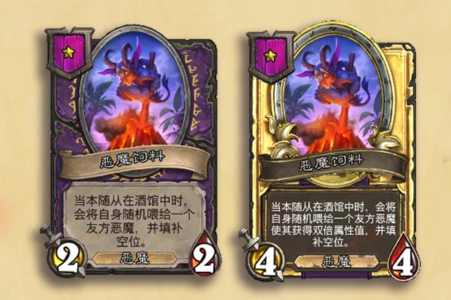 恶魔种族,这次获得了一个叫”饲料“的新关键词。这个机制的运作方式比较特别,带有饲料标记的随从,会进入专属的随从池。当你刷新酒馆的时候,如果出现了饲料随从,场上饥饿的恶魔,就会直接把它吃掉,然后获得那个随从的全部属性,酒馆的位置,会重新刷出别的随从。这个机制让恶魔流派的成长速度变快了,前期可以通过不断刷新,来喂养核心恶魔,让它们的身材快速膨胀。不过要注意的是,饲料随从被吃掉后就没了,所以要算好时机,别浪费了主要的饲料卡。
