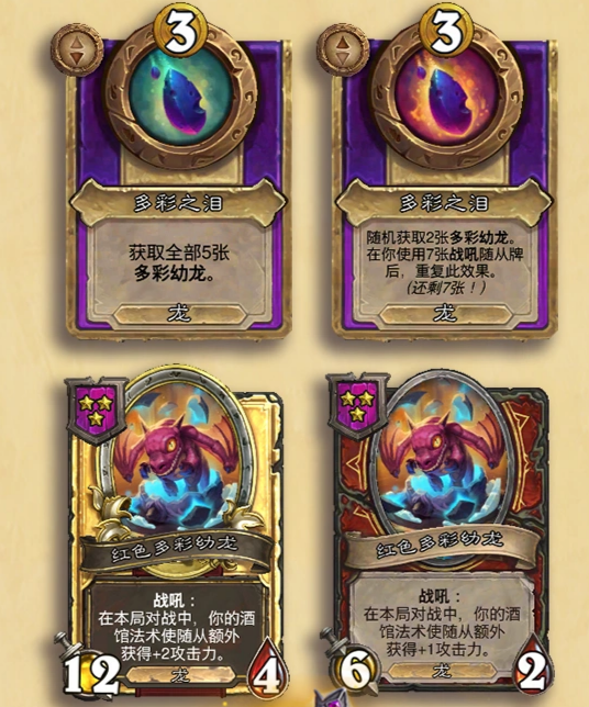 龙族也有了新玩法,新增的”多彩幼龙“关键词,给龙流派带来了更多变化。每条多彩幼龙可以给的效果都是不一样的,不仅能强化龙随从的战斗力,还可以增强酒馆法术的效果。这让龙族的构筑思路变得更灵活了,玩家可以按场上的情况,来选择合适的幼龙,打出不同的combo。